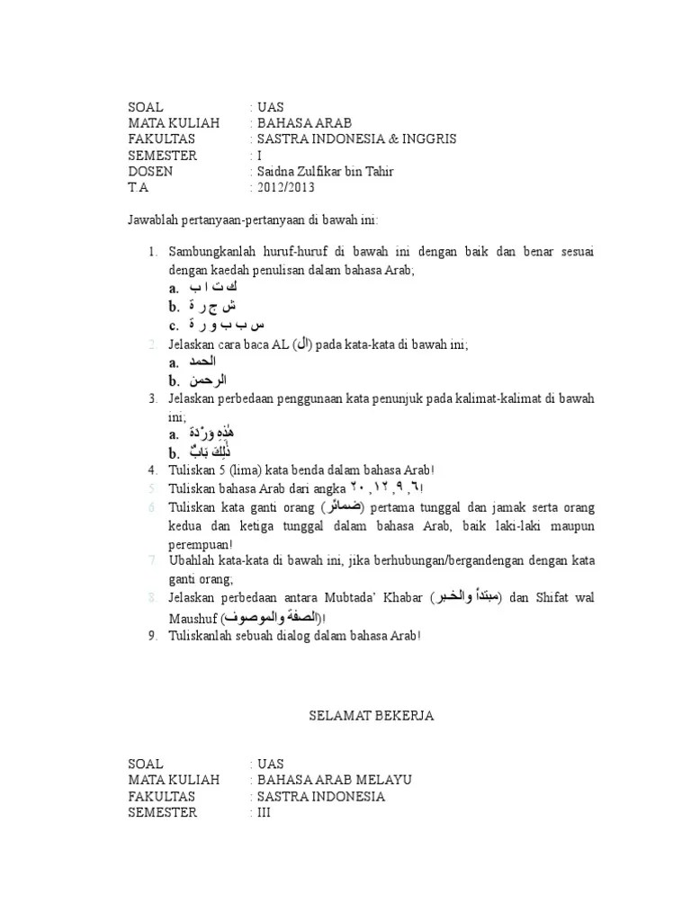 Soal Bahasa Arab Kuliah / Soal Bahasa Arab Masuk Pasca Sarjana Lasopapick / Soal bahasa arab kls 2 uas ganjil.